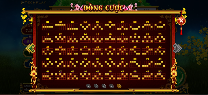 Game mang đến 50 dòng chơi. Theo đó, số tiền cược sẽ được tính là giá trị cược x dòng cược. Theo đó, ví dụ bạn cược giá trị 20.000đ cho mỗi dòng thì khi ấn quay, số tiền cược là 20.000 x 50 = 1.000.000đ. Trong Cung hỷ phát tài May88 vip, anh em có thể chọn các mức cược như 20đ, 100đ, 500đ, 2.000đ, 10.000đ và max là 20.000đ.
