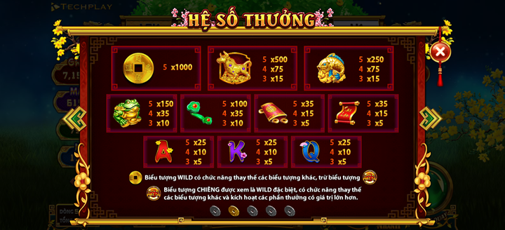 - Ở Vòng quay thường, biểu tượng WILD và CHIÊNG chỉ xuất hiện ở cột 1-3-5. Khi biểu tượng CHIÊNG xuất hiện ở cột nào thì anh em sẽ được thưởng ở cột đó. Nếu CHIÊNG rơi vào cột Free Games thì anh em có thêm 10 lượt quay miễn phí.
